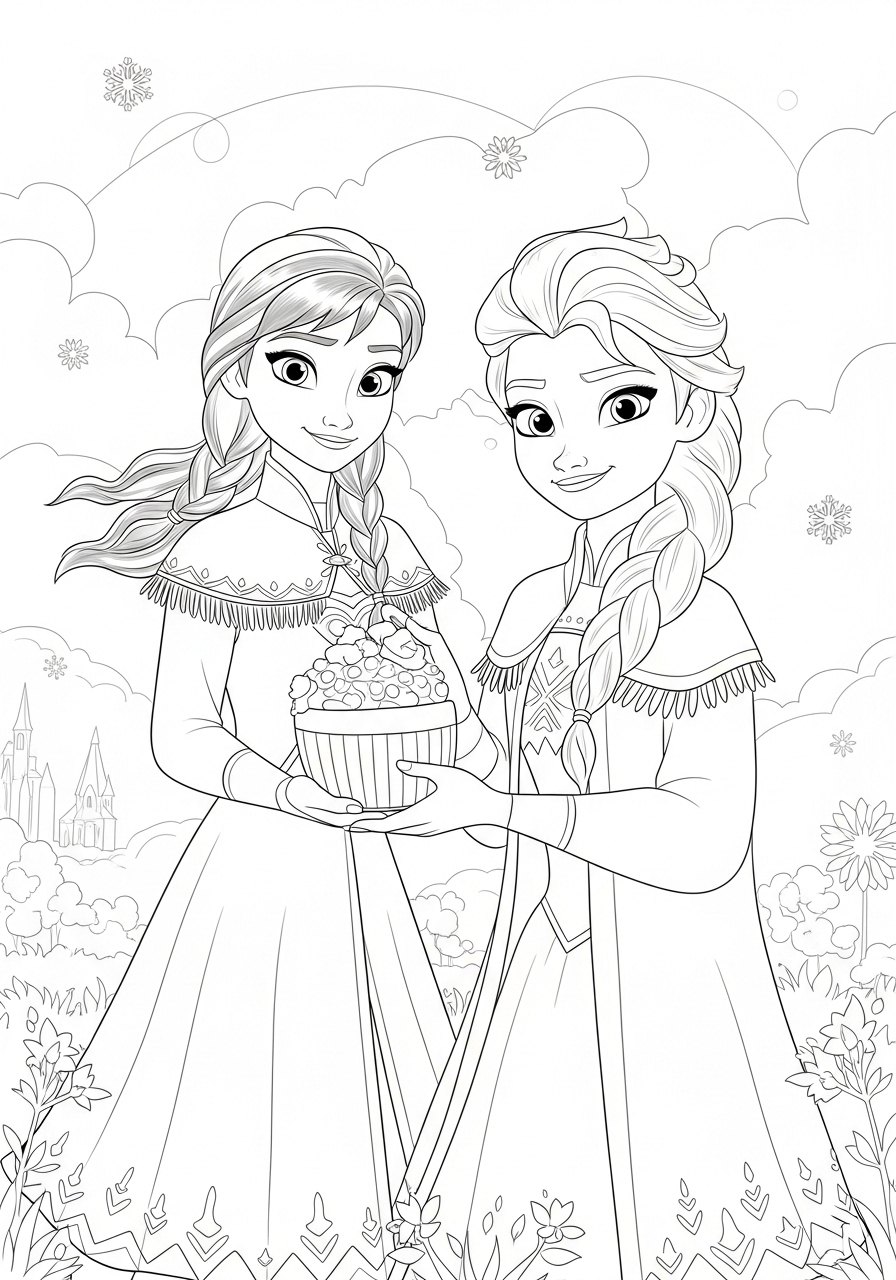 Desenho da Elsa e Anna segurando bolo para imprimir e colorir